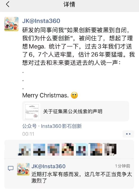 其后,影石创新创始人兼CEO刘靖康在朋友圈转发,并配文称,研发的同事问我“如果创新要被黑到自闭,我们为什么要创新”,被问住了,想起了理想Mega。统计了一下,过去3年我们才送了6、7个人进牢里,估计26年要猛增。我想对过去和未来要送进去的人说一声,Merry Christmas。刘靖康还在评论里表示,“近期打水军有感而发,这几年不正当竞争太激烈了。”
